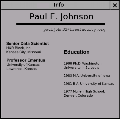 In 2009, I realized I was not interested in teaching political science anymore. That's not great for a professor, as you might expect. KU started a Center for Research Methods and Data Analysis, where I found a natural outlet for my interests (as Associate Director). We did consulting on many kinds of statistical and mathematical models. I set up a cluster computer (and learned to make ethernet cords in the process!). We raised funds for the Center by conducting research contracts with state and federal agencies. In 2013, I became the director in that Center. In jest I say that I served "6 years on a 5 year term" and in 2019 I was ready to leave the university. My favorite accomplishments in that time were the R packages 'kutils', 'stationery', 'rockchalk', and 'semTable'.